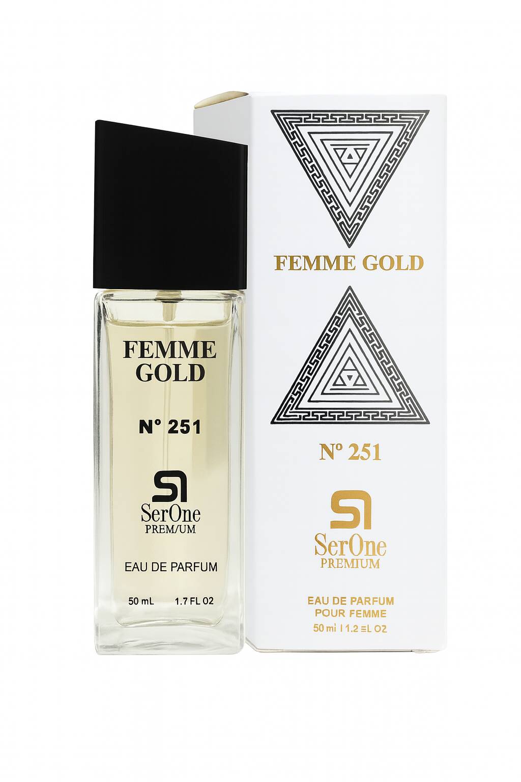 Femme Gold es una fragancia femenina inspirada en el estilo olfativo de Fame de Rabanne, reinterpretada por Serone con una identidad propia, radiante y sofisticada. Su salida combina notas frutales jugosas con un toque chispeante que aporta luminosidad inmediata. En el corazón, un acorde cremoso y floral envuelve la piel con elegancia moderna, evocando sensualidad y un carácter irresistible. El fondo se despliega con matices amaderados suaves y un toque cálido que aporta profundidad y una estela duradera, perfecta para quienes buscan un perfume con presencia y personalidad.
